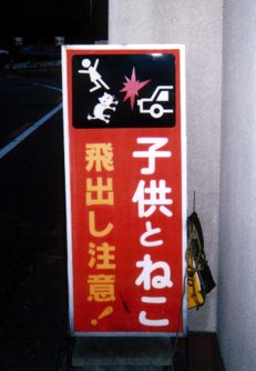 子供とねこに注意って言われてもなぁ。大人や犬はどうでもいいのか。それにしても子供とねこのイラストがまた笑える。