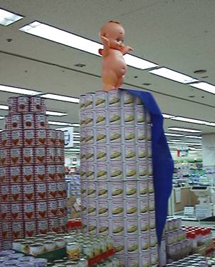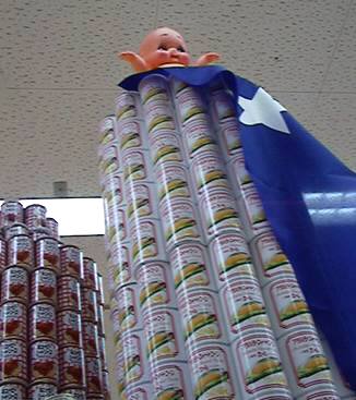 こちらはコーン(とミートソース)の異常発生。というか山積み。たぶん固定してあるんだろうけど、斜めに傾いてて今にも倒れそうであった。上に乗ってるキューピーが謎。